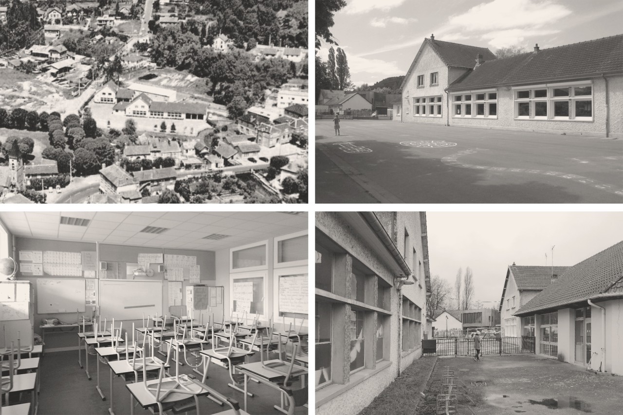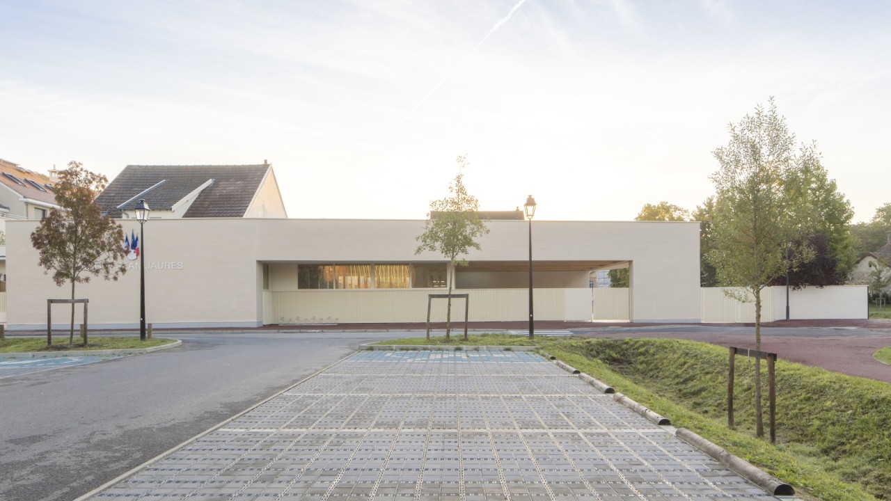 En 1948, il manque en France 5000 écoles neuves. Face à l’urgence, l’état décide de créer des écoles de type standard, constituées de petits pavillons au toit en pente, qui seront « assez peu caractérisés pour ne choquer dans aucune région ». C’est à la suite de ce choix politique que l’école Jean Jaurès est construite en 1955. Deux « pavillons-école » standards, que l’on retrouve dans plusieurs communes d’Île de France, sont construits sur des terres maraichères à la confluence de deux cours d’eau, juste derrière l’ancienne mairie-école construite en 1880. Le reste du terrain est recouvert de bitume pour la cour. Avec le temps les bâtiments sont devenus trop petits et trop déperditifs. Avec le changement climatique et l’artificialisation non maitrisée des bords de rivière en amont, l’école se situe désormais en zone inondable. Enfin l’image de pavillon de l’école n’est plus en phase avec la ville qui s’est développée et densifiée autour. C’est pour ces raisons que nous avons été sollicités pour adapter, étendre et rénover les bâtiments, désimperméabiliser à 100% les cours et faire de l’école un élément structurant du projet « cœur de ville » porté par la commune.