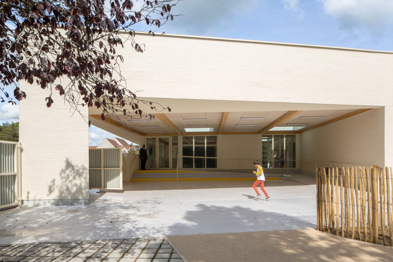 La gangue de terre cuite qui entoure le bâtiment change d’aspect tout au long de la journée selon l’orientation du soleil. A l’usage, le jeu des transparences entre préau, hall d’accueil et bibliothèque déjoue l’impression première de massivité du bâtiment. Les ressauts de la ligne de pied du bâtiment parlent de changement climatique tandis que les ressauts de sa ligne de crète racontent l’histoire de l’école. Entre ces deux lignes, les façades nacrées ont été simplifiées à l’extrême, gouttière cachées, suppression d’avant-toit, porte sous tenture... Elles ne sont plus que le faire-valoir des espaces paysagers exceptionnels environnants, cours pédagogique, cours oasis, parc, berges du Rhodon et de l’Yvette. On regrette seulement le choix de la mairie d’avoir opacifié, pour raison de sécurité, la clôture des cours le long des berges. Mais ces éléments sont démontables. A bon entendeur…