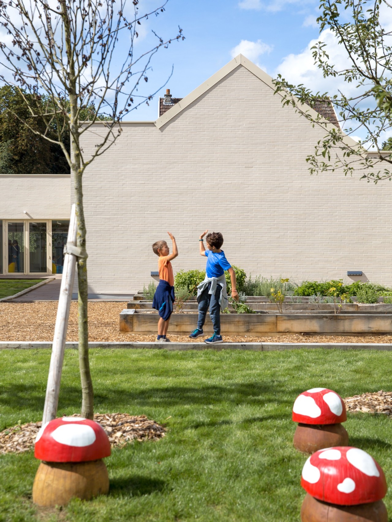 De la même façon qu’une espèce s’adapte aux changements d’environnement, nous avons choisi d’opérer sur l’école Jean-Jaurès une mutation darwinienne de son architecture. Les extensions nécessaires à l’accueil du programme demandé prolongent et reconnectent entre elle les unités standard d’origine pour ne former plus qu’un seul organisme ce qui améliore grandement le fonctionnement de l’école. L’école se reconnecte aussi à l’espace public en s’implantant directement en limite de parcelle. Cette nouvelle façade sur rue donne à l’école sa stature d’équipement. C’est grâce à elle que l’école peut dialoguer avec le complexe sportif C3M et avec l’église. Côté cour, une bande de terrain est restituée pour naturaliser les berges et prolonger les promenades piétonnes existantes le long des cours d’eau. Pour résister aux inondations, les rez-de-chaussée sont réhaussés au-dessus du niveau des plus hautes eaux connu et les cours sont désimperméabilisées à 100%. Deux cours sont aménagées : une cours oasis non genrée au sud et une cour pédagogique avec classe nature et potager au nord. Les nombreuses rampes qui relient le niveau des cours au niveau hors d’eau de l’école font sinuer sans cesse la ligne de pied du bâtiment entre ces deux plans. Les extensions sont réalisées en toitures terrasse tandis que les toitures en pente des unités standard d’origine sont conservées. L’ensemble donne au bâtiment une silhouette atypique. La ligne de crête du bâtiment retrace son histoire et reflète la mutation en cours de la commune. Pour faire face au changement climatique, l’école est recouverte d’une peau unique en écailles de terre cuite qui isole et protège l’ensemble des façades. Tous les détails de la façade s’effacent au profit des lignes de crètes et de pied du bâtiment. Seul le préau fait exception, creusé dans la façade, il marque l’entrée de l’école. Dessiné comme une pièce de vie à part entière, il est traité avec le même soin que les espaces d’accueil intérieurs dont il est le prolongement. Immédiatement adopté par les usagers de l’école, il a été baptisé du nom d’un ancien directeur de l’école « Frankie SAMSON ».